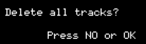 トラックの削除 リファレンス 2024.02.20 トラックを個別に削除 任意のトラックだけを削除(空白にする)には、「トラックのカット」を実行してください。 カットした後に何もしなければ、トラックを削除したことになります。 全トラックの削除 すべてのトラックを一括して削除する場合は、ショートカットを使用します。現在のシーンだけに有効です。アクティブでないシーンに影響はありません。 Shift+STOP 「Delete all tracks?」とメッセージが表示されますので、OK を押すと、選択中のシーンの全トラックが削除されます。 全トラックを削除すると、シーンのルーパー長はリセットされます。その後の録音で再びルーパー長が定義されます。 アンドゥができません。 お気に入りのシーンは、空いている別のシーンにコピーしておくのが良いです。
