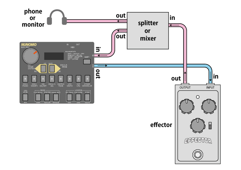 - エフェクターの OUTPUT を スプリッター or ミキサー に接続