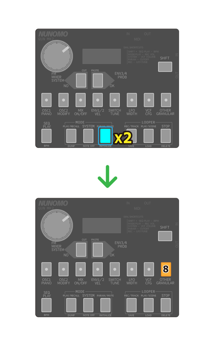 パラメーターを設定するには、1~8 を押しながら、Dial,NO,OK を組み合わせて操作します。
