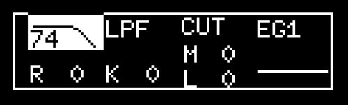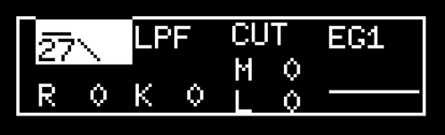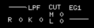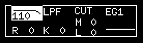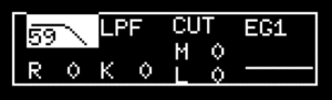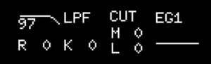 この例では [VCF_smide] の 1 にパラメーター・ロックを適用したので、上の画像のように、CUTOFF のセクションが反転表示になり、CUTOFF値が表示されています。