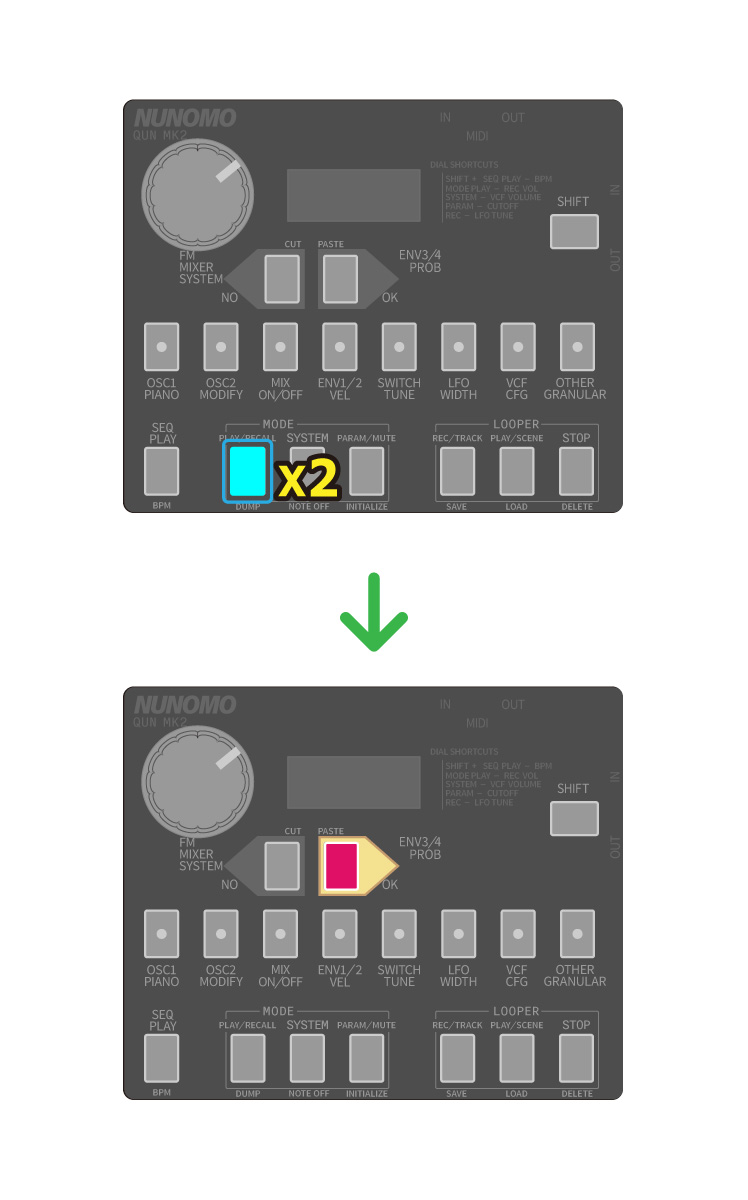 - 本体の起動時やプリセット初期化直後の状態では、すべてのステップが「+127」の状態です。