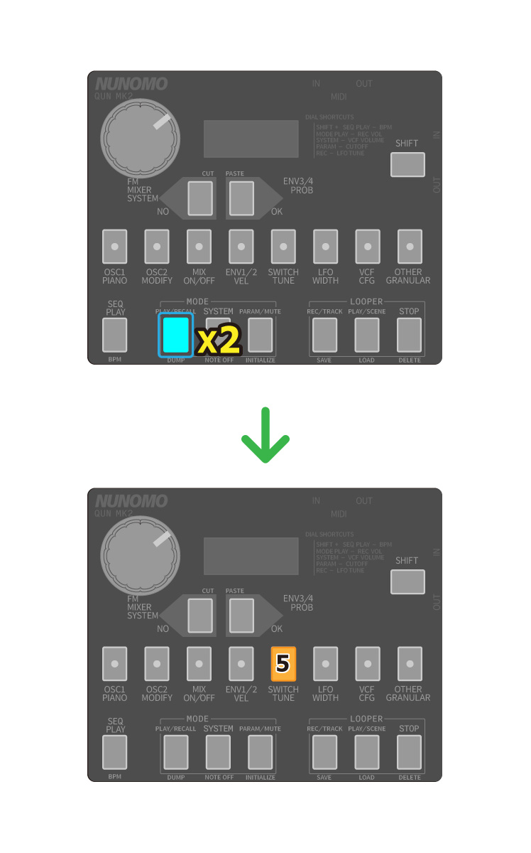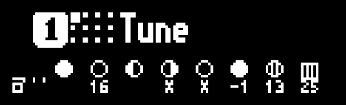 このとき、ディスプレイ上部にはサブステップとTune値と音階が表示されます。 - シーケンスページが複数ある場合は、ページごとに設定してください。