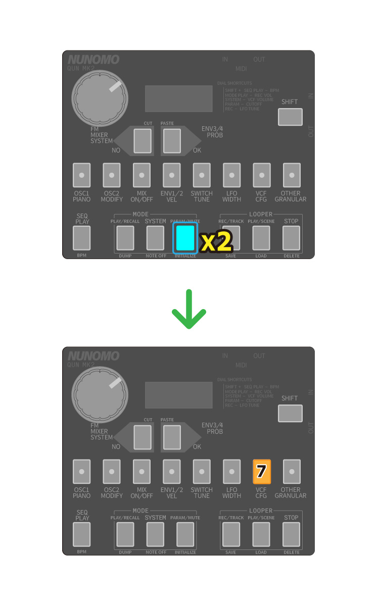 パラメーターを設定するには、1~8 を押しながら、Dial,NO,OK を組み合わせて操作します。